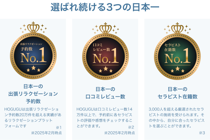 HOGUGU(ホググ)は、出張マッサージ予約数22万件・口コミレビュー数16万件を突破(※2025年8月現在)している日本最大級の出張リラクゼーションプラットフォームです。